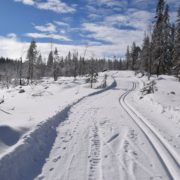 Det er et tråkk eller en sti man kan følge helt til foten av Trettekollen. Denne hadde jeg store problemer med å følge på grunn av føret. Det ble mye gåing i åpent lende. Heldigvis har jeg en grei GPS på mobilen, så det var aldri noe tvil om hvor jeg var. Og etter hvert åpnet skogen seg for en bred gate i terrenget. Jeg hadde kommet fram til Mårledningen. Dette er en høyspentlinje som bringer elektrisk kraft fra Rjukan til det sentrale Østlandet. Mye skog har blitt ofret for at denne kraftgata skal få fridd leide, og mastene er stygge som juling i terrenget, men jeg blir også litt fascinert av den. Det er et massivt byggverk som har krevd, og krever, mye arbeid og vedlikehold for å fungere som det skal.
