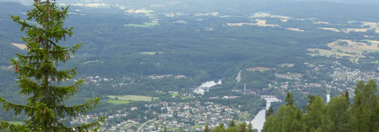 Finnebrenna er ikke noe mål for de som vil ha utsyn til områdene rundt. Til det er vegetasjonen på toppen for tett. Men jeg hadde også planlagt å ta med meg nabokollen Vollmyråsen, og på den var det fantastisk utsikt sørover. Det hadde blitt hogd på åsen for noen år siden, så det var ikke noe særlig vegetasjon der som hindret utsikten.
