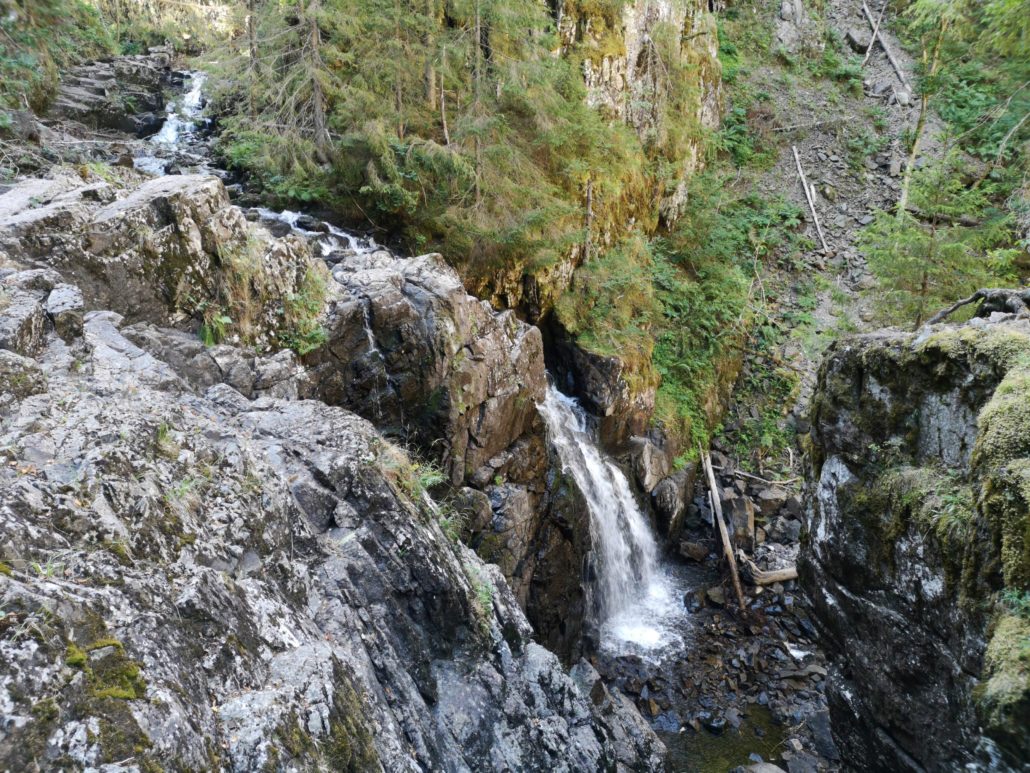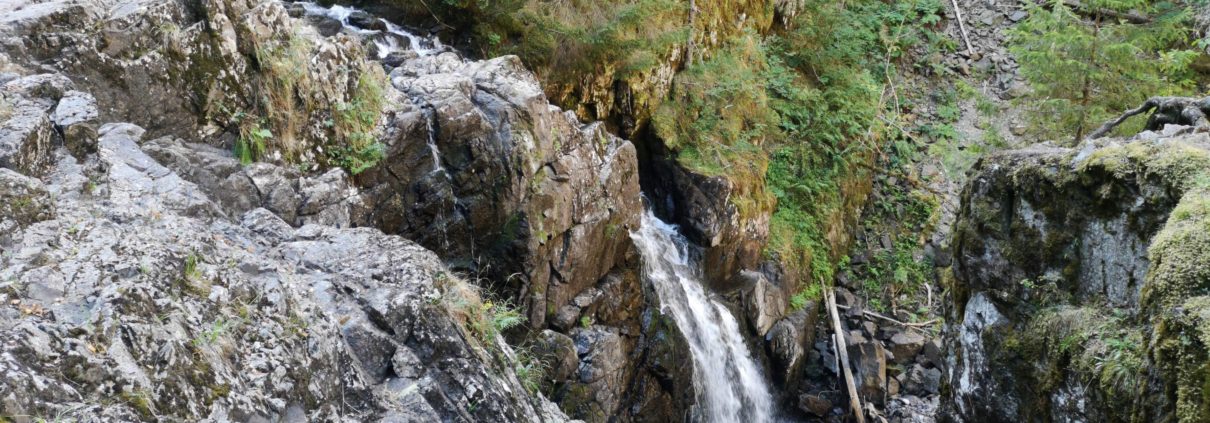 Oppe ved Gamledammen tok jeg en ørliten rast før jeg begav meg på veien ned igjen. Jeg fant stien ned til juvet og gikk den et stykke. Nede ved elven i juvet skjønte jeg fort at dette ikke ville bli lett. På grunn av regnværet de siste dagene gikk elva godt over sine bredder, og gjorde det vanskelig å finne fotfeste på tørr grunn. Steinene som ikke befant seg under vann var i tillegg såpeglatte. Jeg hadde ikke gått langt før jeg skjønte at dette ikke ville føre fram. Litt leit, men det eneste fornuftige var å snu mens jeg ennå kunne.