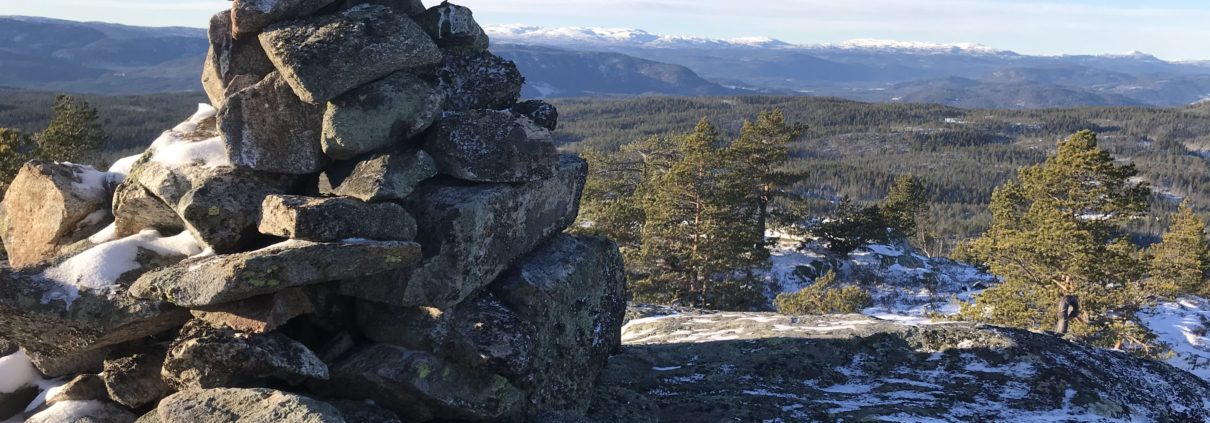 Turen opp er ikke mer enn en kilometer lang, og jeg kom greit opp litt sør for toppen. Toppområdet er enda mer glissent bevokst enn lia og det åpnet seg utsikt i flere retninger. Selve steinvarden på Surtvarden var synlig fra der jeg kom opp, så det ble en enkel tur bortover til den. Herfra er det enda bedre utsikt til områdene rundt. De østre og nordlige delene av Holtfjell ligger synlig like ved, men det mest spektakulære utsynet er mot vest til Blefjell. Og særlig nå som det ligger snø på toppene blir det herlig kontrast mot den blå himmelen.