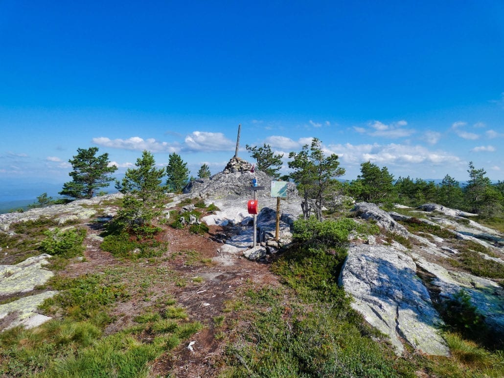 Jeg fortsatte uansett mot hovedtoppen på Fjellstulfjell for i alle fall å kunne si at jeg har vært der. Det var en kort marsj gjennom kupert og myrlendt terreng, før en siste kneik skilte meg og toppen. Det var det samme der med utsikten: Tatt av disen. Men jeg kunne skimte Blefjell nordover. Sikkert nydelig her om høsten når fargene er på sitt mest intense.