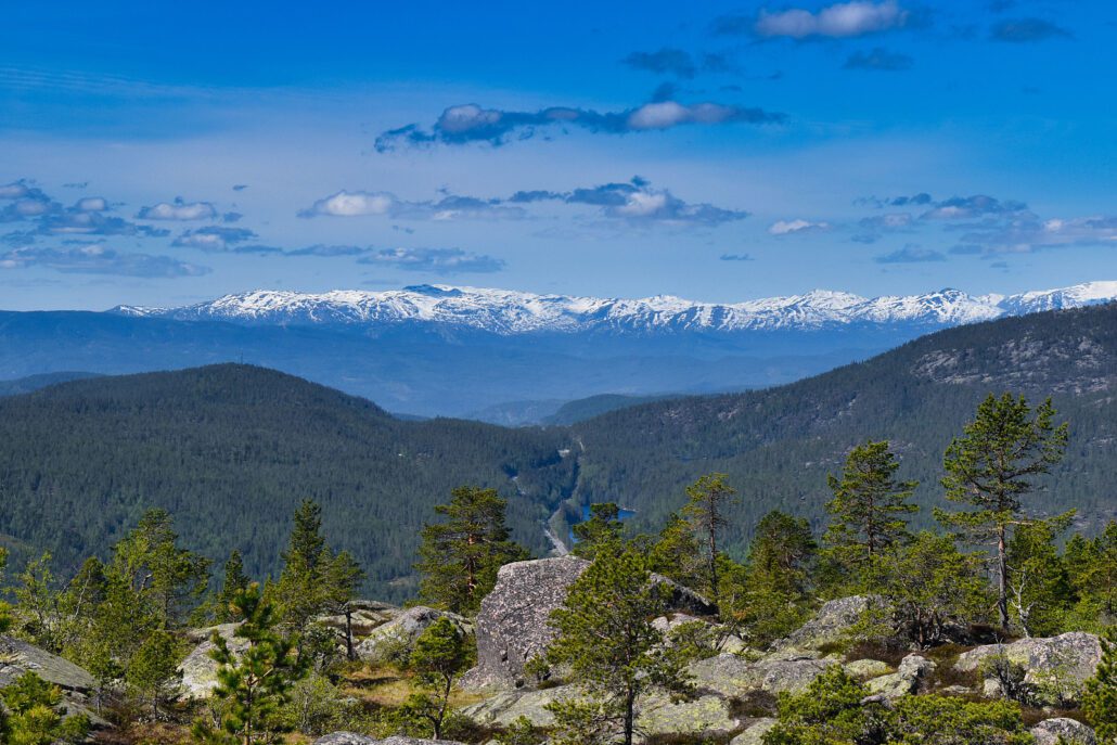 Men lia er stort sett grei å gå, med mye berg så det tok ikke lang tid før jeg var oppe på Kolknuten også. Og her var det i alle fall fin utsikt nordover; Lifjell, Fjellstulfjell, Gaustatoppen, Blefjell og Jonsknuten lå alle i horisonten. Og Meheia kå under meg, rimelig langt under meg også.