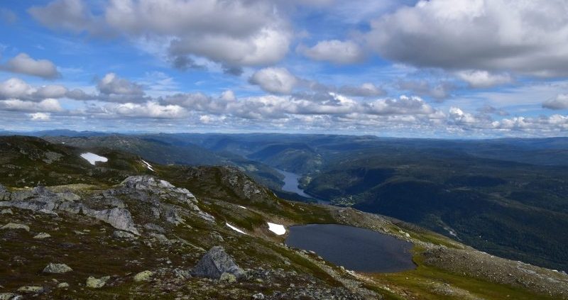På toppen var det et fantastisk rundskue. Gaustatoppen, Skirveggen, Hallingskarvet, Reineskarvet, Trillemarka og Norefjell var alle godt innenfor synsvidde, i tillegg til de nærmere toppene Storegrønut og Skagsåsen. Norefjorden kunne jeg også se langt under meg.
