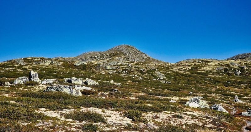 Jeg startet med å følge stien mot Imingfjell / Mårbu så lenge jeg følte det var hensiktsmessig. Etter at jeg var kommet over bjørkebeltet, ble terrenget litt mer oversiktlig å gå i så da tok jeg av stien på et punkt hvor jeg hadde fri sikt til fjellet jeg hadde pekt meg ut. Da ble det labbing oppover i lia gjennom underlag som vekslet mellom fast underlag med reinlav eller noe mykere myrunderlag. Det var egentlig ganske grei skuring, og jeg kom meg pent opp til den toppen jeg hadde som mål. Det var da jeg så at GPS-trackinga mi hadde meg på en topp uten navn. Men den hadde en varde, og en fantastisk utsikt over Jønndalen og Solheimstulen rett under meg. Lengre mot nord tok Hallingskarvet det meste av horisonten, mens Hardangerjøkulen lå litt mer mot vest.