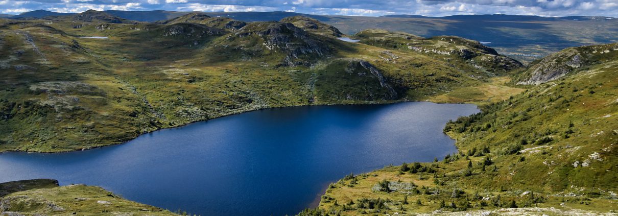 Jeg kunne fortsatt på stien. Den går rundt vannet på sørsiden og snor seg opp lia til Hallandsfjellet. Men det virket kortere å gå på nordsiden av vannet, halvveis ned og så ta opp et dalsøkk derfra. Og siden jeg var på snaufellet var det greit å holde oversikt på hvor jeg var.