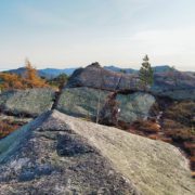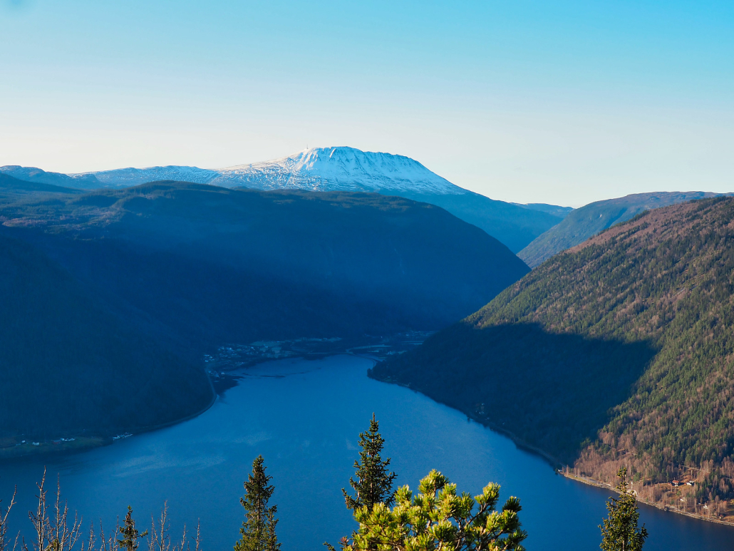 Turen opp til toppen gikk greit. Det er ikke noe særlig til utsikt fra topp-punktet, men litt nedenfor, på vestsiden er det en åpning i vegetasjonen hvor man ser rett ned i Tinnsjøen og mot Hardangervidda til nord. Gaustatoppen ligger rett fram, og i dag så den ekstra stilig ut med et lite lag med nysnø på seg.