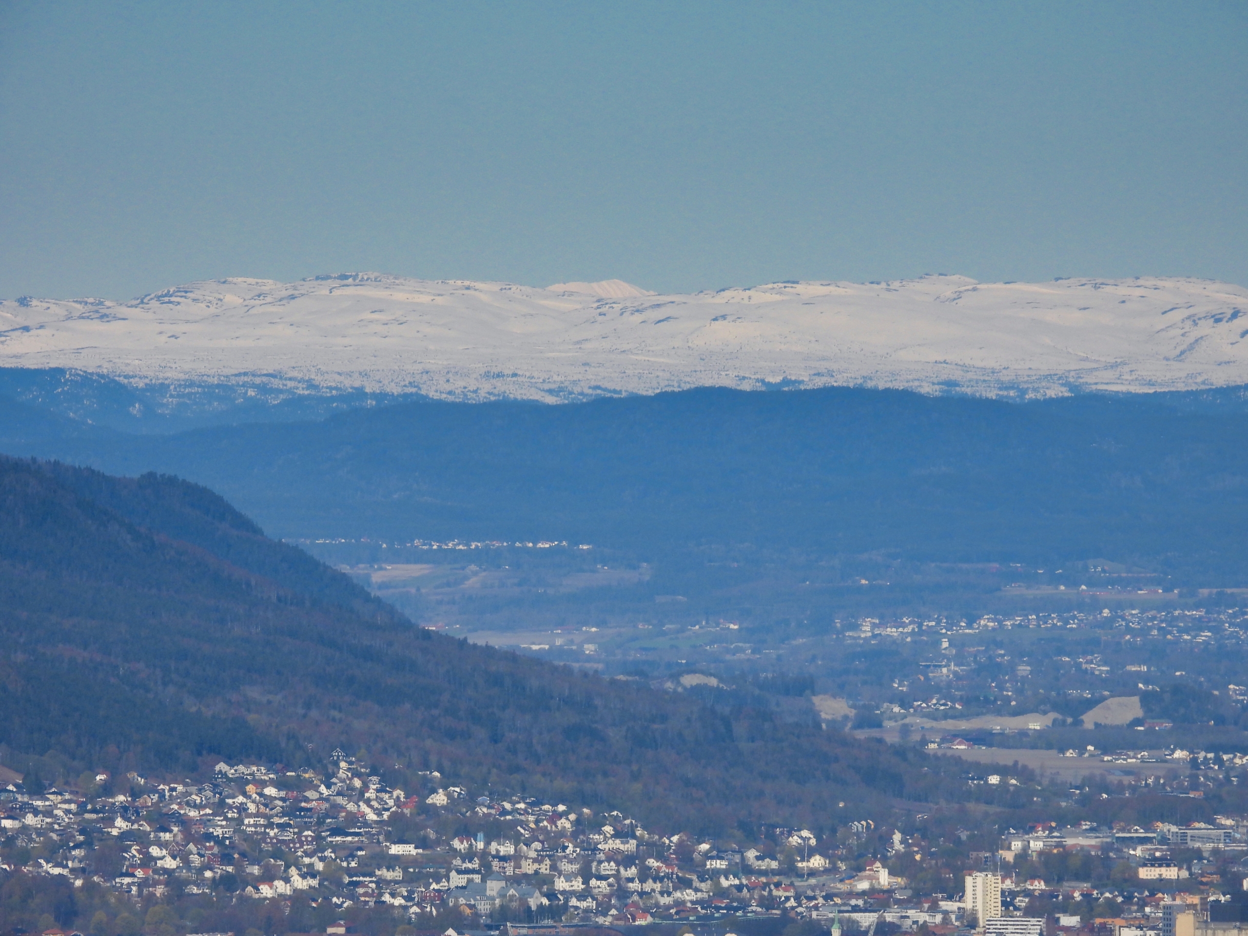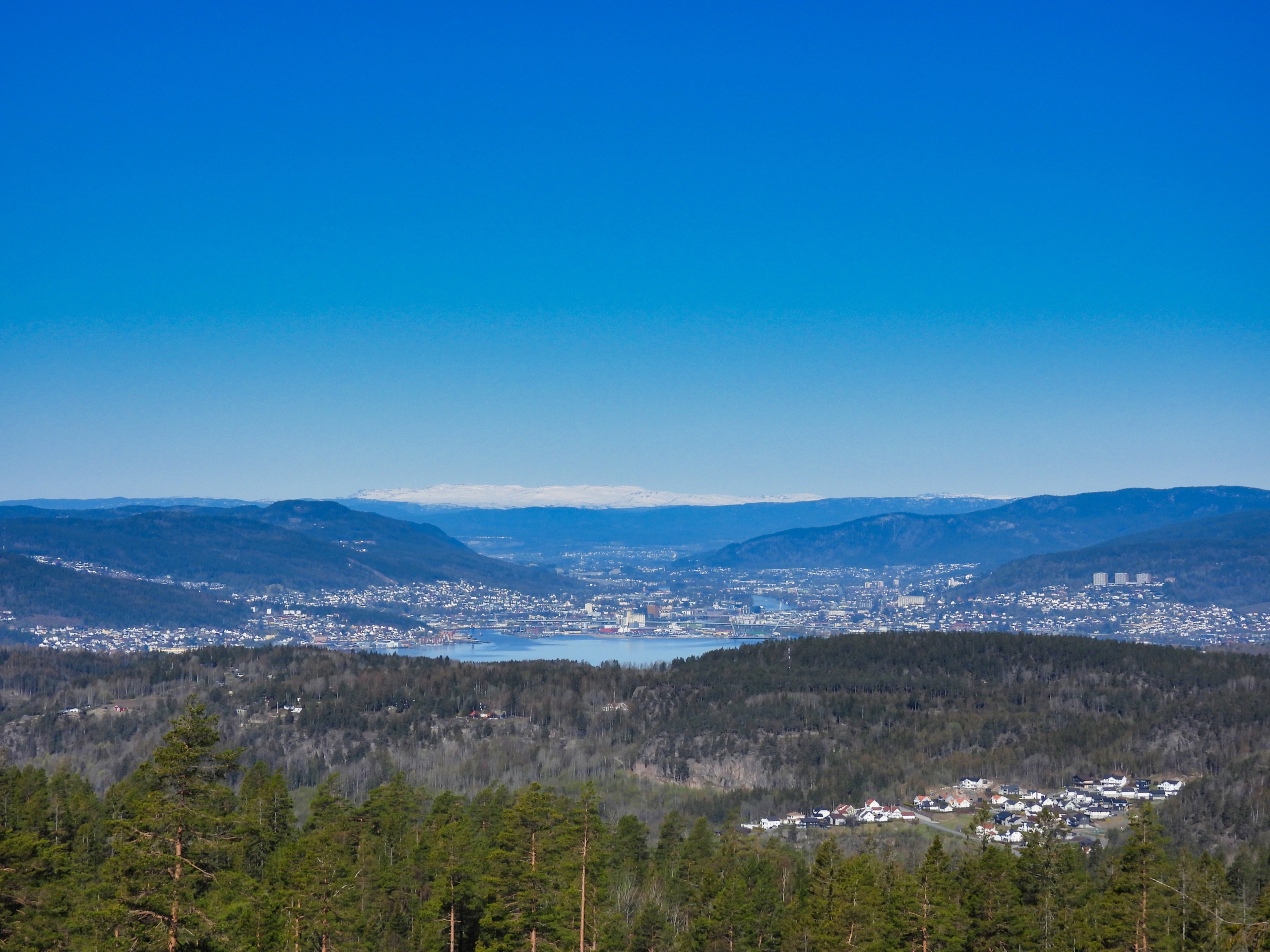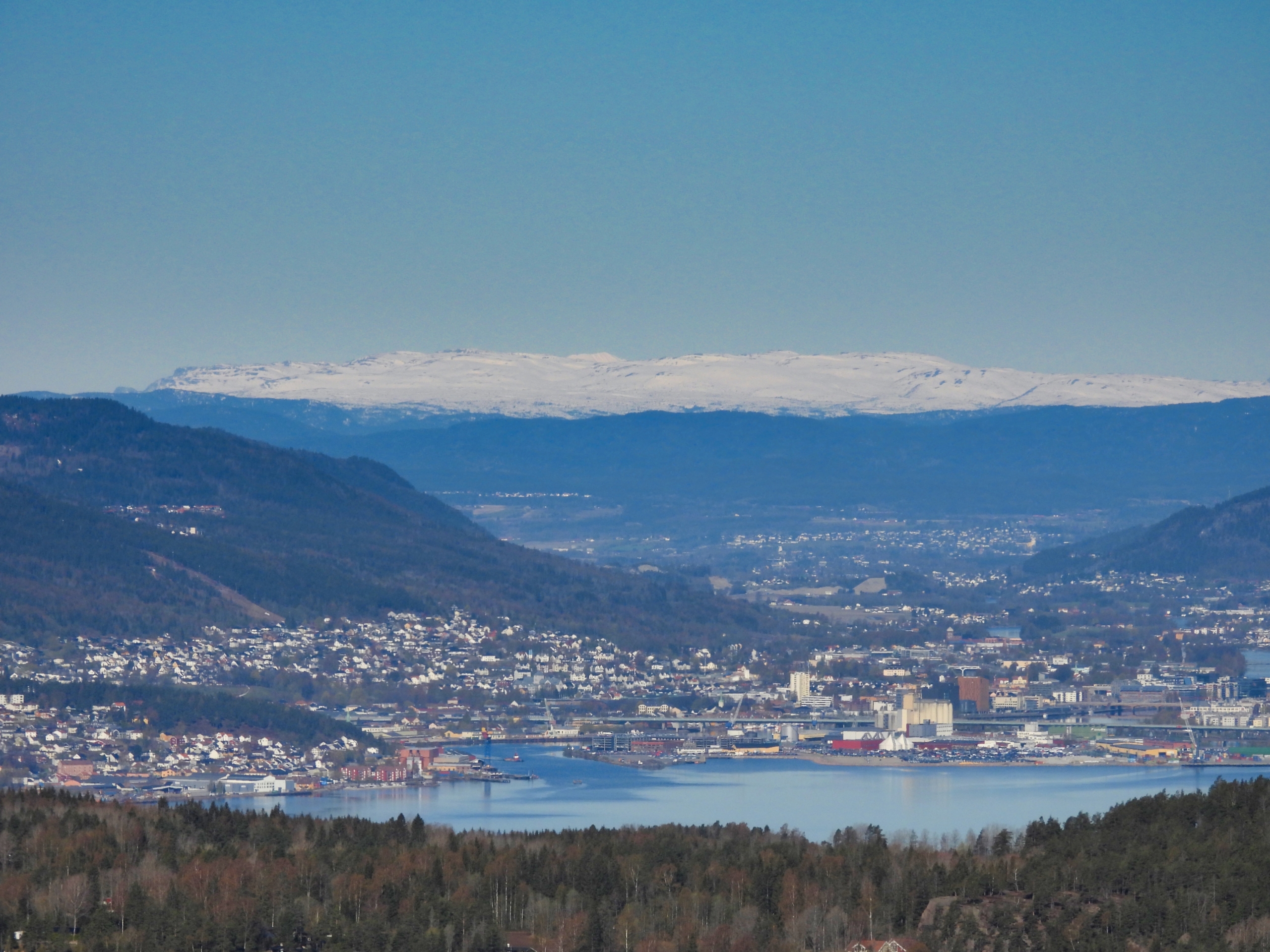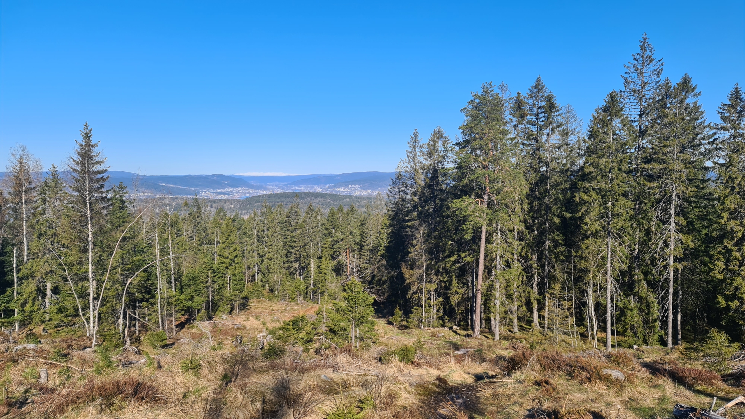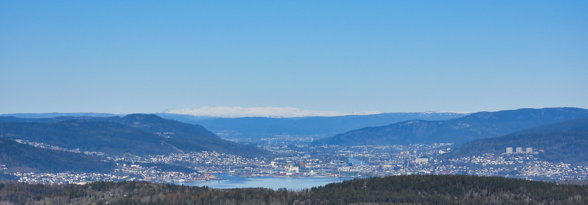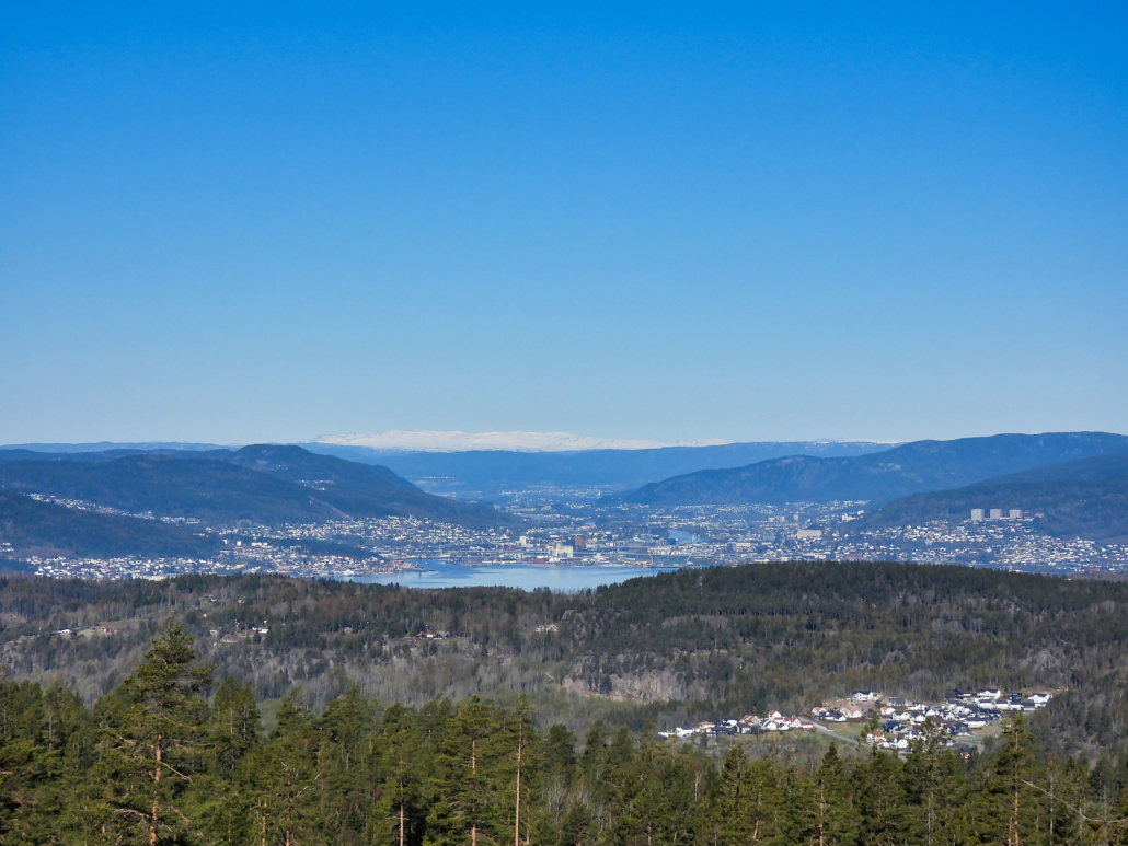 Like før toppen kommer man til turens fineste utsiktspunkt. Her står man på toppen av en liten skrent og har fri utsikt mot Drammen og Blefjell. Jeg fant fram kameraet og fikk sikret meg noen blinkskudd, før jeg gikk de siste meterne opp til toppen, bare for å kunne si at jeg har vært der.
