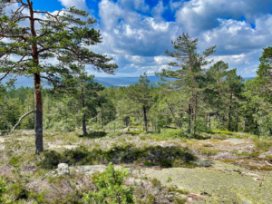 Deretter stod den ukjente delen av turen for døren. Det går blåmerka sti opp til Knausen fra Glitreveien, som jeg ikke har gått før. Det ble stort sett en hyggelig opplevelse. Bratt til å begynne med, men en grei gammel tømmervei å følge. Mye brekkasje etter vinterens tunge snøfall, og blåmerkinga var ikke god. Oppe av de verste bakkene åpner terrenget seg mer med glissen furuskog, og det stiger pent og pyntelig opp til Knausen.