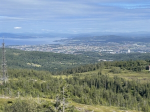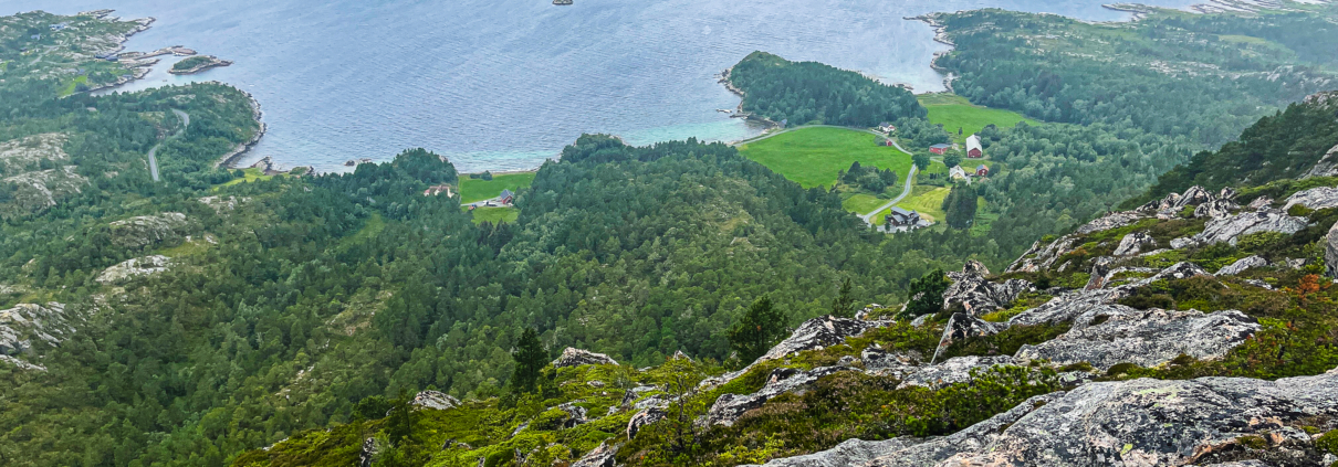Til å begynne med var terrenget slakt hellende i furuskog og myr. Etter hvert tok bergene mer og mer over, og skogen ble tynnere. Jeg fikk litt utsikt over de nærest liggende øyene, Smøla f.eks.